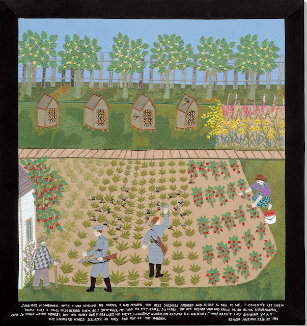 एस्तेर और उसकी तेरह वर्षीय बहन भाग गईं (परिवार के बाकी लोग मारे गए)। वे केवल पोलिश बोलकर और यह दिखावा करके जीवित रहे कि वे जर्मन नहीं जानते (उनके मूल यिडिश से निकटता से संबंधित)। वे पास के एक गाँव में एक बुजुर्ग दम्पति के लिए काम खोजने के लिए गुप्त रूप से गए। उपरोक्त दृश्य में, एस्तेर उस बगीचे में काम करती है जिसे बूढ़े व्यक्ति ने उसे लगाने की अनुमति दी थी। एक दिन नाज़ियों ने आकर उससे पूछताछ करने की कोशिश की। वह कशीदाकारी कैप्शन में बताती है: