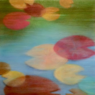 Nu sunt atât de sigur că aceasta este misiunea lui DeFusco, oricât de seducătoare este paleta lui. În timp ce în Culori plutitoare Ne putem imagina apa albastră făcând loc verdelui, sau jocul de umbre pe apă având acest efect de culoare, lipsa detaliilor din nuferi ne spune că artista nu vrea să ne convingă de natura a ceea ce a văzut. . Ceea ce a „captat” a fost o viziune, în care o scenă cu crini în apă a servit drept inspirație pentru o incursiune în culoare, centrul ei emoțional și imaginativ. Un alt lucru de bază de remarcat este lovitura imparțială a lui DeFusco. În Culori plutitoare, ca și în multe dintre piesele din acest spectacol, loviturile puternice înainte și înapoi nu arată nici un impuls de a imita natura. Se deplasează pe scenă pentru a forma un ecran și creează o mișcare simultană imposibilă sugerată de tăieturile din frunze: unele se deplasează la stânga, altele la dreapta, toate în același curent. (Dacă inspectați imaginile de pe pagina ei de Facebook, cu linkul de mai sus, puteți înțelege mai bine aceste suprafețe.)